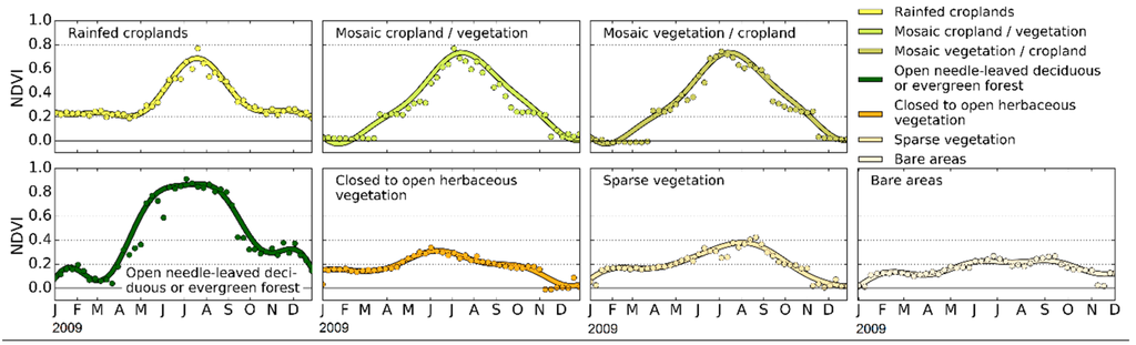To address the contamination in NDVI, iHANTS was applied to model a time series iteratively using user-selected periodic components. Outliers are identified at each iteration with respect to the current model by applying a user-selected threshold. Noise can be filtered by removing the high frequency and keeping the lower frequency components. Moreover, the reconstruction gives estimates of daily NDVI. We used the four lower frequency components, namely 12-month, 6-month, 4-month and 3-month components. To assess the accuracy of the reconstruction, we did a qualitative check by selecting a pixel from each of the seven dominant land cover types (Figure 6) and observed that the adopted method did capture correctly the phenology response of each land cover type. The areas classified as Rain-fed cropland, mosaic cropland/vegetation, mosaic vegetation/cropland, and open deciduous or evergreen forest have a relatively large increase in NDVI during the summer period, while land cover types—characterised as closed to open herbaceous vegetation, sparse vegetation and bare area—still have a smaller yet clear peak in summer. Abrupt changes in NDVI, such as those due to snowmelt in a short period of time, are difficult to capture by iHANTS, as in April for mosaic vegetation/cropland (Figure 6), at least without using high frequency components.