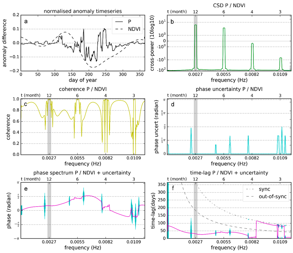 Procedure and intermediate results to estimate the time lag of the annual frequency (0.0027 Hz). (a) nomalized anomaly time series; (b) CSD P/NDVI; (c) coherence P/NDVI; (d) phase uncertainly P/NDVI; (e) phase spectrum P/NDVI + uncertainty; (f) time-lag P/NDVI + uncertainty. The cross-spectrum (b) and coherence (c) are computed using the standardized precipitation and NDVI anomaly (a). Using the cross-spectrum, the phase spectrum (e) and time lag (f) are obtained and the phase uncertainty (d) provides the distribution of the phase spectrum.