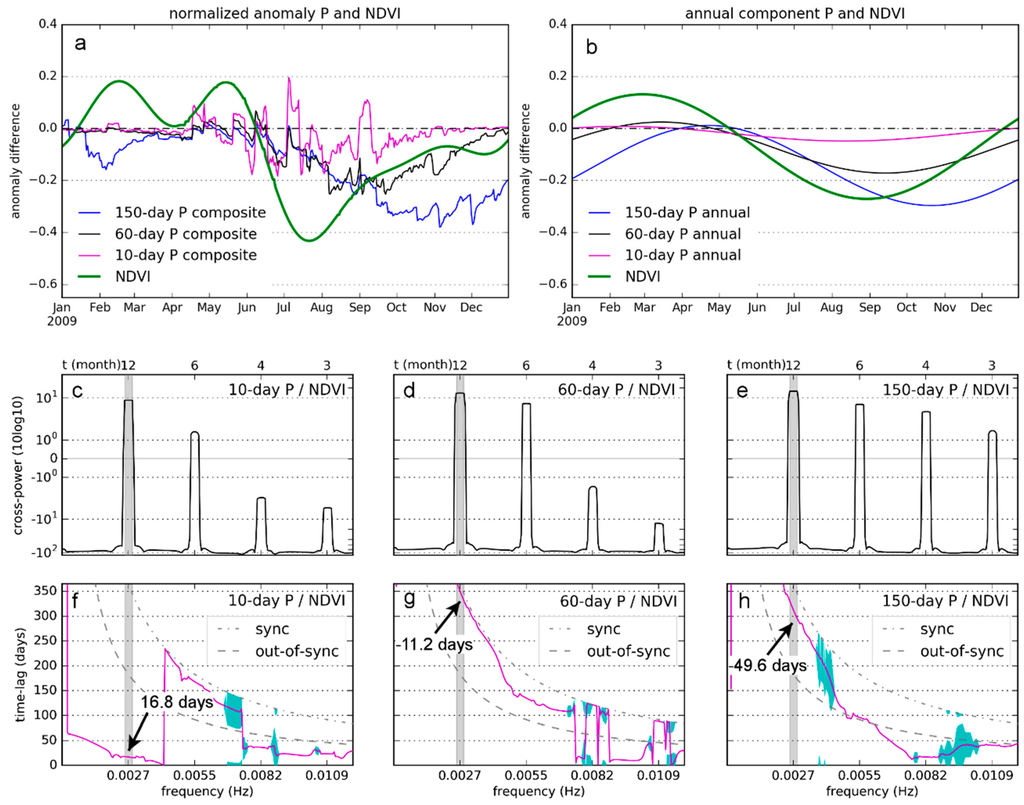 As explained in Section 3.2 three durations of antecedent precipitation were evaluated (Figure 8). A longer duration smooths the anomaly time series to yield a better estimate of the amplitude (Figure 8a, 150-day P composite). A shorter duration yields a more complex signal (Figure 8a, 10-day P composite), although the dominant annual component is still observable as was assessed by a qualitative check on the 10-day P composite in Figure 8b. Figure 8a,b suggest that the time lag is positive (NDVI lags P) for the 10-day Ps only, and negative for 60 and 150 days and was verified for the annual components using cross-spectral analysis. The annual component had the strongest power for each duration of antecedent precipitation (Figure 8c–e), where the time lags for the annual component were 16.8, −11.2 and −49.6 days for the 10-, 60- and 150-day Ps, respectively (Figure 8f–h).