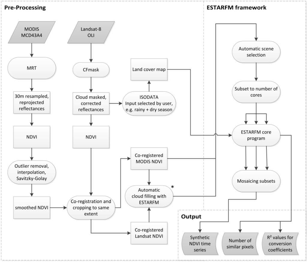 Workflow of the automated ESTARFM framework including the pre-processing of input data. The left box shows the pre-processing of MODIS and Landsat input data including the automatic filling of cloud gaps in the Landsat data. The upper right box displays the automatic generation of time series based on the ESTARFM framework. The lower right box summarizes the output layers of the framework. * See also Figure 4.