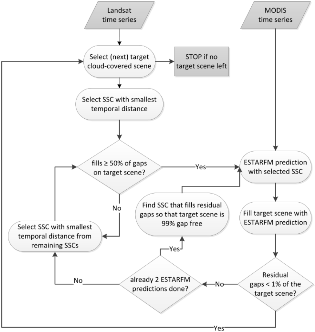 In a first step of this gap filling, the first target scene with cloud gaps to be filled is selected. The shoulder scene combination (SSC), i.e., one Landsat image before and one after the target scene, fulfilling two conditions is identified: (a) the temporal distance between these shoulder scenes has to be as small as possible; and (b) an ESTARFM prediction derived from this SSC has to fill at least 50% of the gaps in the target scene. The selected SSC is used to generate an ESTARFM prediction and fill the target scene. If after that the residual gaps make up less than one percent, the next cloud-affected scene is processed. If the gaps are still larger than one percent, the first step is repeated based on the remaining SSC candidates. If after this second iteration the residual gaps in the target scene is still above one percent, the SSC is selected that can fill the residual gaps so that the target scene is at least 99% gap free. This way, a maximum of three synthetic scenes have to be generated to fill one target scene and the filling is completed in a reasonable amount of time.