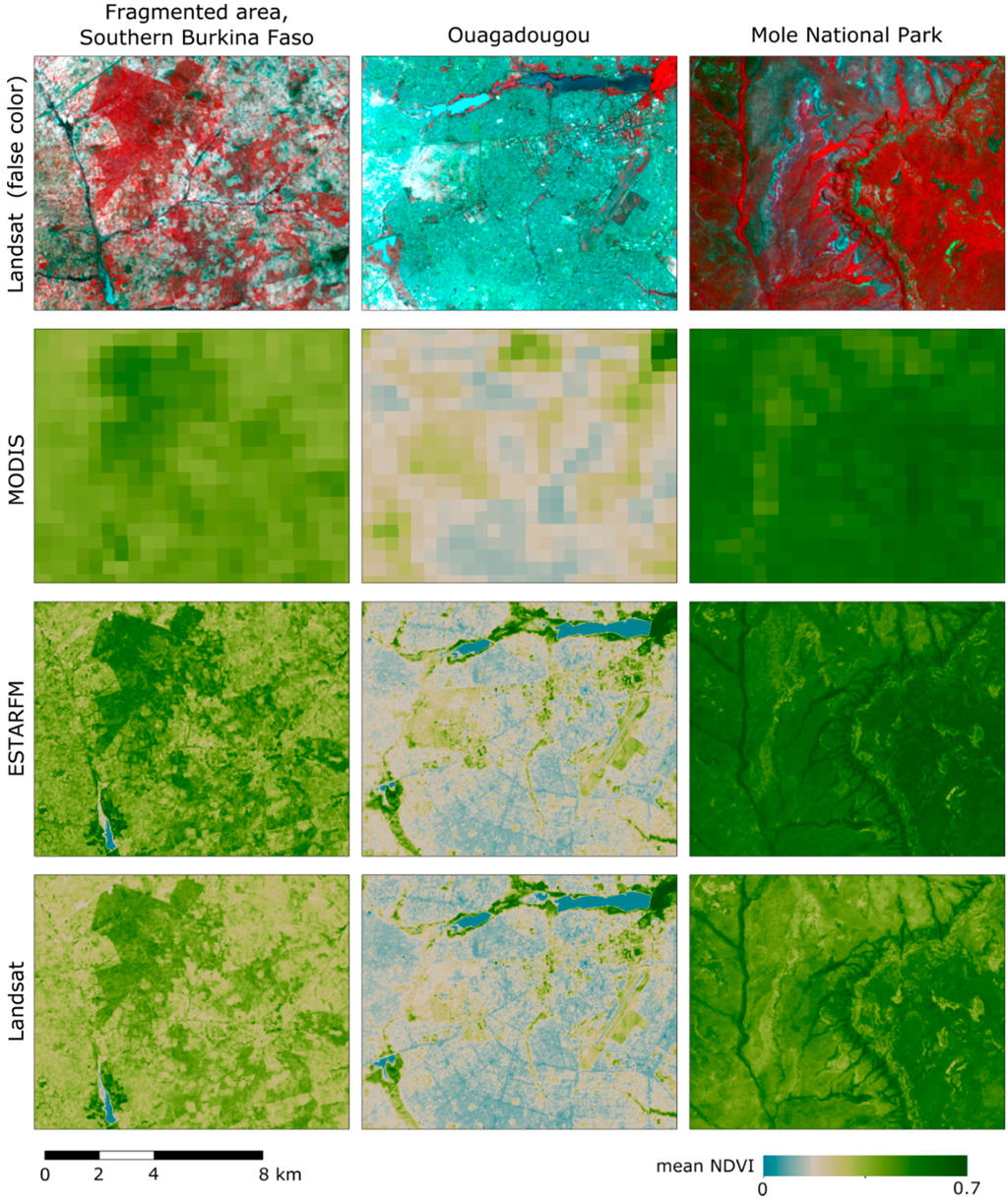 Landsat false color composite (NIR-R-G, row 1), mean annual NDVI (year 2014) derived from MODIS (row 2), ESTARFM (row 3) and Landsat (row 4) for three focus areas: a fragmented landscape area in the south of Burkina Faso (left column), the city of Ouagadougou in Burkina Faso (middle column) and the Mole National Park in Ghana (right column).