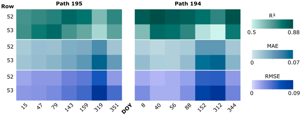 The cross-validation of the predicted ESTARFM time series comprises three accuracy measures (Figure 8): the coefficient of determination (R2), the mean absolute error (MAE), and the root mean square error (RMSE). In general, the northeastern tile (194/52) produced the lowest error values with MAE around 0.02 and average RMSE values of 0.03. Also, the correlations between predicted and observed NDVI values were the highest for this tile (average R2 = 0.83). Comparing the northern tiles (row 52) with the southern tiles (row 53), it becomes evident that ESTARFM predictions for the northern tiles commonly produce higher accuracies and lower error values (ranging between 0.01 and 0.04 MAE in the north and between 0.01 and 0.07 MAE in the south).