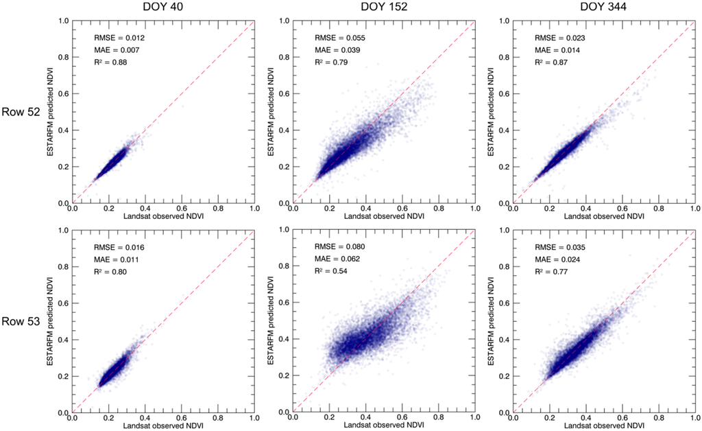 Scatterplots of observed Landsat versus predicted ESTARFM NDVI values for Landsat path 194 for three selected dates representing the late dry season in early 2014 (DOY 40), the vegetative season (DOY 152) and the early dry season at the end of 2014 (DOY 344). Upper three plots show Landsat row 52, lower three plots Landsat row 53.