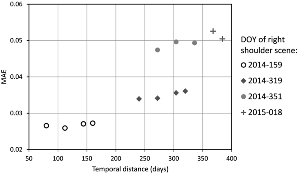 Relationship between the mean absolute error (MAE) and the temporal distance between the shoulder scene combinations (SSC). The MAE was calculated by using all possible SSC for predicting the Landsat scene (195/52) acquired on DOY 143, 2014, and the MAE was derived between predicted scenes and observed scene. The different symbols represent different acquisition dates of the right shoulder scene, e.g., the four diamond symbols represent four predictions of DOY 143 with the same right shoulder (DOY 319) but different left shoulders.