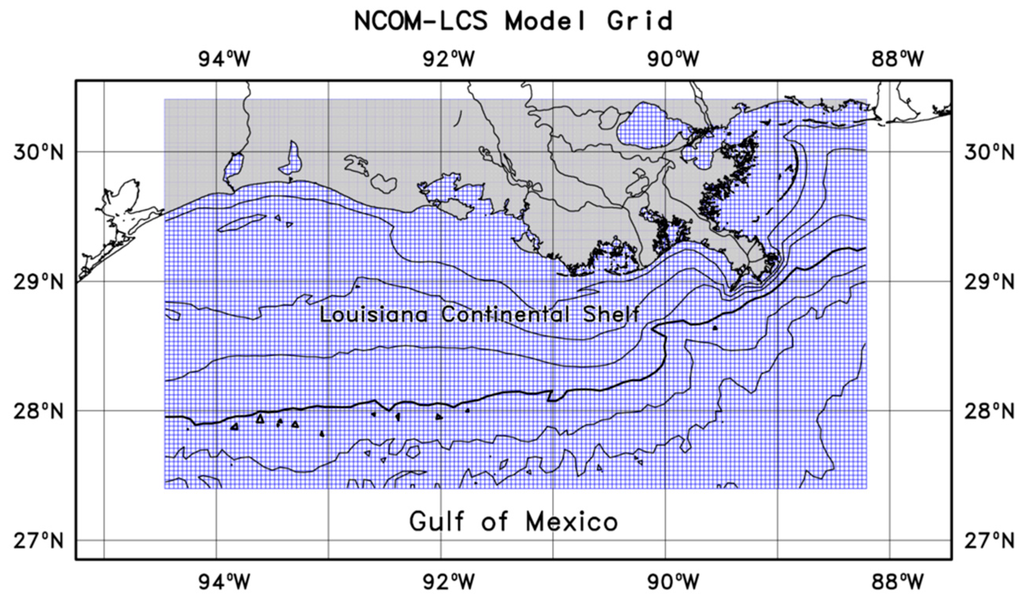 The ocean circulation model used in this study is an application of the US Naval Research Laboratory’s Ocean Nowcast/Forecast System [] on the Louisiana Continental Shelf. The NRL Ocean Nowcast/Forecast System is an integration of a data-assimilating, dynamical ocean model, a statistical data-analysis model, and various data streams for ocean bathymetry, climatological data, surface forcing, open boundary forcing, and observations for data assimilation. The dynamic model within the system is the Navy Coastal Ocean Model (NCOM) []; therefore we denote the model as NCOM-LCS.