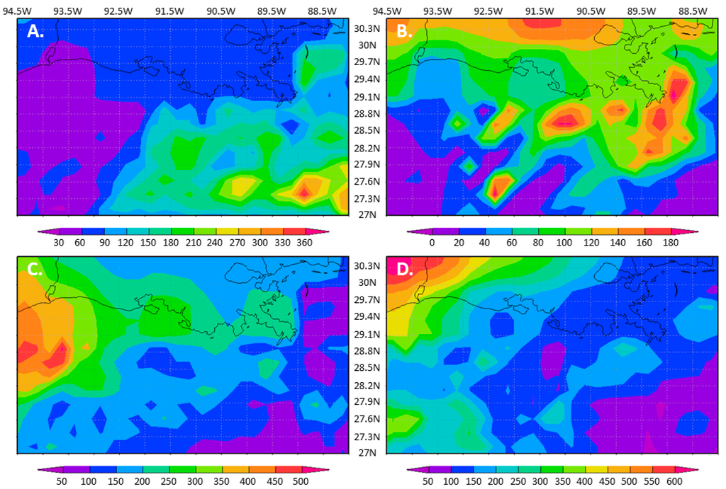 Spaceborne radars and passive microwave radiometers, such as the Tropical Rainfall Measurement Mission’s (TRMM) Precipitation Radar (PR) and Microwave Imager (TMI), can provide information on integrated column precipitation content, areal distribution, and intensity. Rainfall accumulation data covering the NCOM-LCS model domain and time period were obtained from the TRMM Online Visualization and Analysis System (TOVAS) web site []. We used the 3B43 V7 data product, with horizontal resolution of 0.25° and temporal resolution of one month. This product was developed to provide best-estimate precipitation rates from TRMM and other data sources (such as rain gauges, Advanced Microwave Scanning Radiometer for Earth Observing Systems (AMSR-E), Special Sensor Microwave Imager (SSMI), and others) []. Figure 4 shows example rainfall distributions for 4 months in 2006. Interannual monthly rainfall variability, averaged over the entire model domain (27.0°N–30.5°N, 88°W–94.5°W), is shown in Figure 5. TRMM rainfall was spatially interpolated to the model grid. Surface salinity flux for the NCOM-LCS “test” run was then calculated as the difference between precipitation (the TRMM rainfall) and evaporation (derived from NOGAPS latent heat flux) and applied to the model surface layer. Temporal interpolation was performed at each model time step.