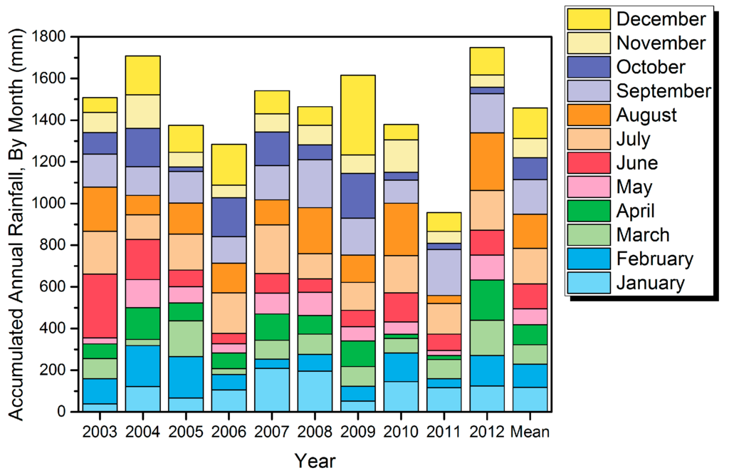 Monthly accumulated rainfall, averaged over the model domain, 2003–2012.