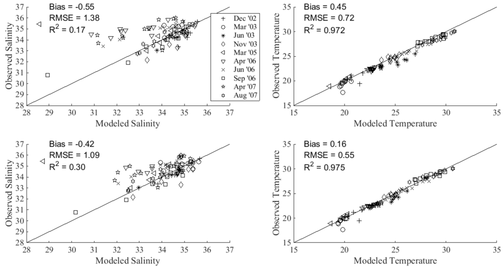 Comparison of mean transect salinity and temperature from observations during 12 cruises from 2 December 2002 to 7 August 2007 and corresponding values from models without (upper plots) and with (lower plots) satellite-derived Kd and rainfall. The legend shows the dates of cruises. In the lower plots, smaller mean bias and root mean square error (RMSE) and larger coefficient of determination (R2) were obtained using satellite data. The lines represent the 1:1 line.