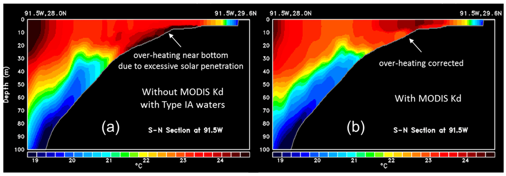 In a model inter-comparison study, Fennel et al. [] shows the NCOM-LCS applying the Kd from MODIS produced colder bottom water on the Louisiana shelf than other two models that used constant and uniform Kd. The colder bottom water in NCOM-LCS is due to reduced solar penetration in the nearshore murky water which leads to a much lower bias evaluated against the observations than other two models, again demonstrating the importance of applying spatially/temporally varying satellite Kd on the overall model temperature prediction.