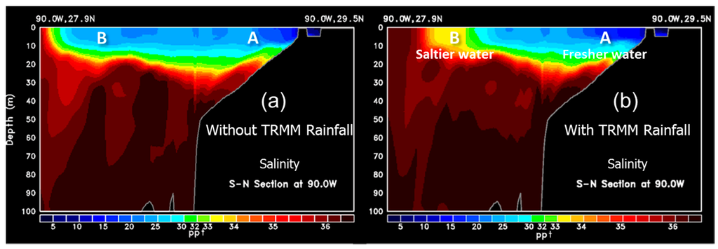 Salinity predictions are also improved when satellite data are included, with RMSE between the observations and model values decreasing from 1.38 to 1.09 (Figure 6, left column) (Table 2). The impact of applying surface salinity flux estimated with TRMM rainfall is further demonstrated in the salinity profiles along a cross-section at 90°W across the shelf (Figure 8). The water nearshore is fresher and offshore saltier (Figure 8b) with TRMM rainfall included, compared to the reference case (Figure 8a). Without the TRMM rainfall, we observed lower correlation (R2 = 0.17) between the model predictions and the observations. Particularly, during 2006, the salinity predictions were much fresher than the observed (Figure 6, left-top panel). This is because 2006 was a dry year, as indicated by less rainfall over much of the model domain relative to other years in the modeling time period (Figure 5) and less river discharge (Figure 2). Using monthly salinity climatology to calculate surface salinity flux (as in the reference case) resulted in over-estimation of salinity flux and lower modeled salinity values compared to observations. Applying temporally and spatially varying TRMM rainfall improved the salinity prediction overall (Figure 6, left-bottom panel) and the over-estimation of fresh water during the 2006 dry season was much reduced.