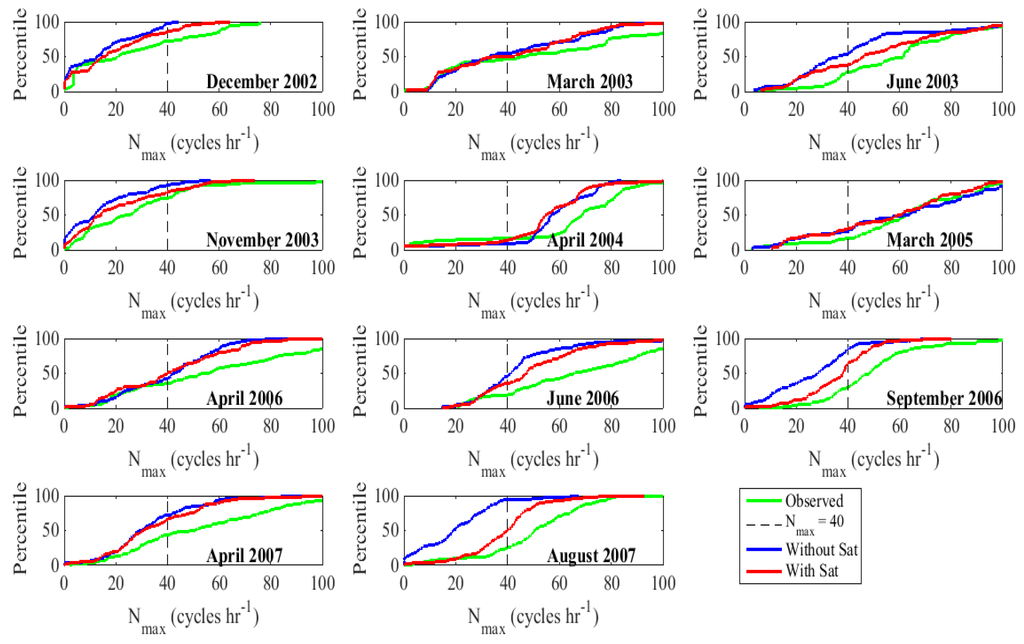 Cumulative distribution function of maximum buoyancy frequency (Nmax), which is an index of the strength of vertical stratifications, for 12 cruises (20–90 stations occupied per cruise from December 2002 to August 2007. Observations (green) were compared to a reference model run without satellite data (blue) and a test model run with satellite data (red). The black dashed vertical line at N = 40 represents the buoyancy frequency at which hypoxia begins to occur [].
