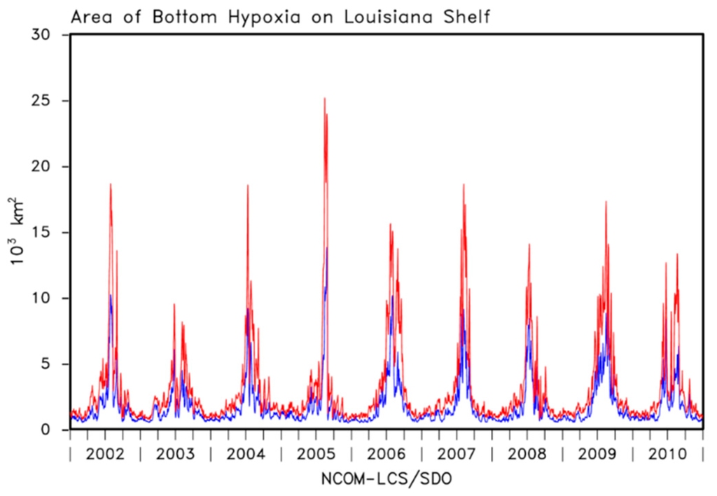 The hypoxia model based on SDO described in Section 3 was applied to estimate the dissolved oxygen concentration over the entire NCOM-LCS domain from 2002 to 2010 applying ocean predictions (temperature, salinity, current and mixing coefficient) from the twin experiment. The area of bottom water hypoxia was calculated across the grid as the area where the bottom layer oxygen concentration was less than 64 mmol/m3. Figure 10 shows the time series of the simulated bottom hypoxia area on the Louisiana shelf. The blue curve indicates the reference case and the red curve the test case with satellite data. The area of bottom hypoxia has a strong seasonal variation with the largest hypoxic area observed during the summer season due to the decay of the phytoplankton bloom following large spring river nutrient runoff, e.g., Lohrenz et al. [] and increasing light levels. But it is also due to increased water column stratification [,] and to changes in summer time current direction from westward down coast to eastward up coast, which increases the nutrient retention time on the shelf []. Interannual variation is also evident related to differences in yearly river runoff and physical conditions in ocean such as temperature, salinity and current and in atmosphere such as wind and solar radiation.