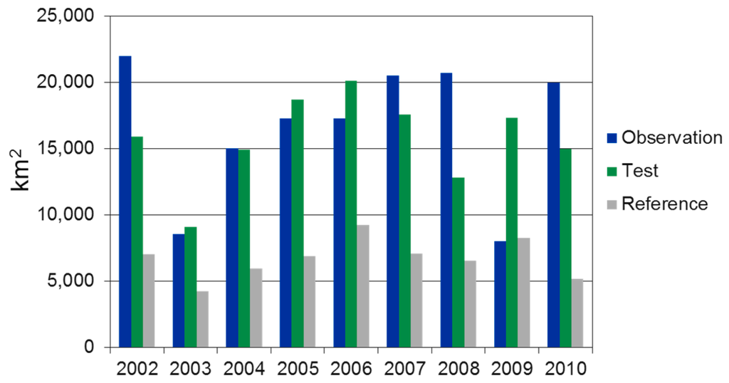 Including satellite data in the model simulations has a substantial impact on the predicted bottom hypoxia. On average, the area of bottom hypoxia on the shelf almost doubled for the test case (inclusion of satellite data, Figure 10). The stronger stratification due to the improved temperature and salinity prediction with satellite data reduces the vertical mixing and constrains the exchange of oxygen with the surface layer; therefore the oxygen concentration in the bottom layer decreases and the area of bottom hypoxia increases. In the SDO model, the lower bottom water temperature in the test case also results in lower microbial oxygen consumption. However, owing to the stronger stratification in the test case, the smaller oxygen consumption rate is sufficient to drawdown oxygen to hypoxic levels. The year to year comparison of the predicted bottom water hypoxia area, calculated from model grids where low dissolved oxygen (<64 mmol/m3) persisted over 15 days each season, indicates that it is overall much more comparable to the estimation based on the cruise observations [,] when satellite data are included in the model (Figure 11). There are inconsistencies. For example, we are uncertain as why in the test case the model predicted a rather large hypoxia area in 2009 relative to the observation. We do not have CTD measurements for that year to make a close exam. Otherwise, the observed hypoxia area was based on a single week-long cruise, the observation may not be representative, e.g., hypoxia may occur outside of cruise duration, therefore area of hypoxia may be underestimated for that year.