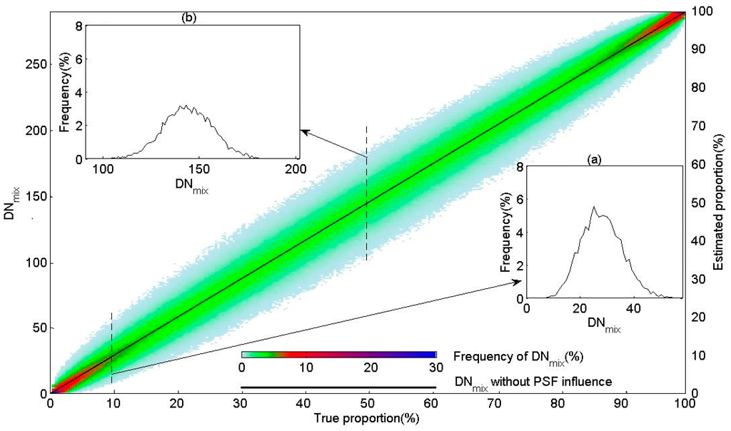 6]. Our study is somewhat similar to theirs in the shape of the upper and lower bounds of the true proportion variation; however, the fusiform shape of the former appears to be wider than the latter. The reason lies in the difference in the ways by which they acquired the bounding curves. For the generation of the lower bound, their procedure included an additional step that a target object located in the fringe zone was redistributed to the central zone. Because of the maximum response in the center of the PSF, the enlarged mixed-pixel DN certainly increased the lower bound of the true proportion variation; in the same way, the upper bound was reduced. Moreover, the models describing the bound curves were expanded here and can represent the bounds of the true proportion variation at any probability level. In addition to the nonuniformity of the sensor’s PSF, the intra-class spectral variability may also bring about the distribution of the object proportion estimations (