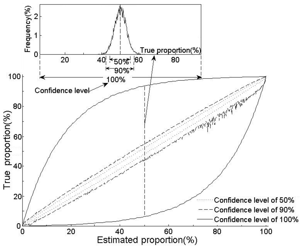 et al. made a thorough inquiry of the maximum range of the true proportion variation in relation to any estimated proportion using simulated data with two extreme object distribution patterns [