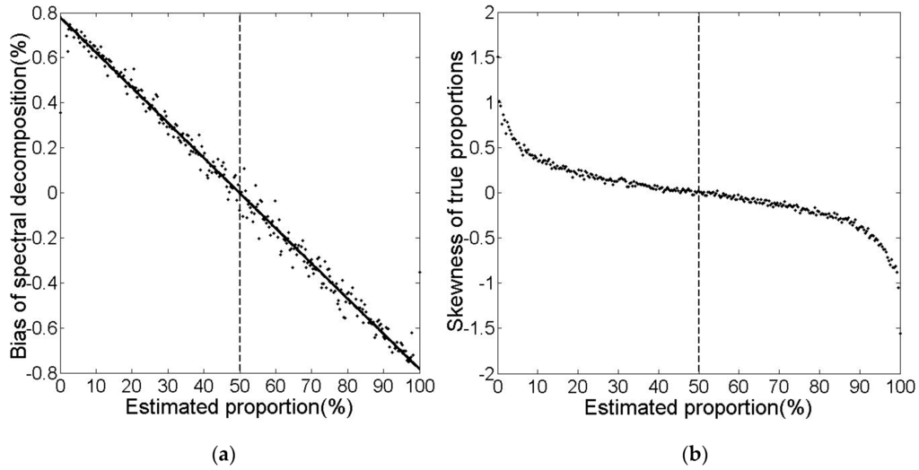 et al. analyzed the upper and lower boundaries of the true proportion variation of land cover against the estimated proportion extracted by spectral unmixing for the situation where the target objects were distributed over the central and marginal areas of the spatial extent of the sensor response, respectively [