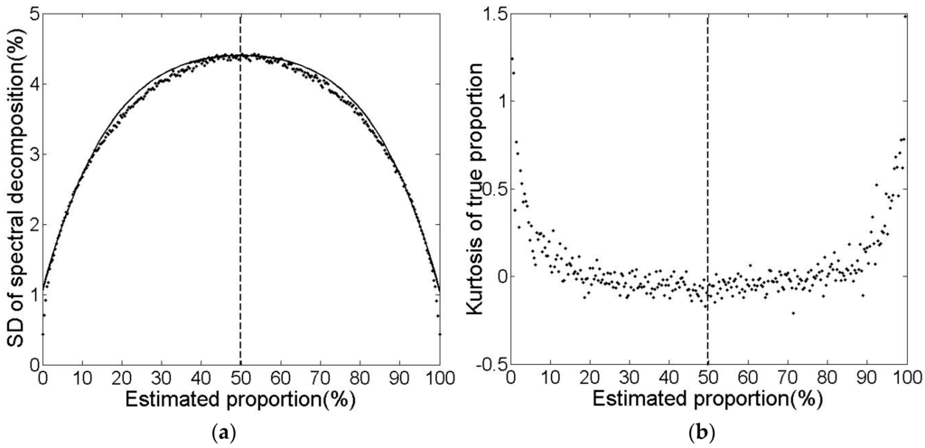 In the real world, a surface scene can be approximated by two-dimensional lattice data with a fairly small cell size. In that way, there are a considerable number of object distribution patterns for a given object proportion, and the number of mixed pixels that can be produced by the nonuniform response of a sensor is also immense. Conversely, for the determined DN of a mixed pixel, the object proportion estimated by the spectral unmixing is a unique value, but the number of its corresponding true object proportions is enormous for a vast array of object distribution patterns. Consequently, the impact of the PSF nonuniformity on the spectral unmixing is reflected in the statistical distribution of the true object proportion varying around the estimated one and is delineated by the relationship between the estimated object proportion and the statistical parameters of the proportion estimation error; the latter variable includes the bias and variance of the proportion estimation error.