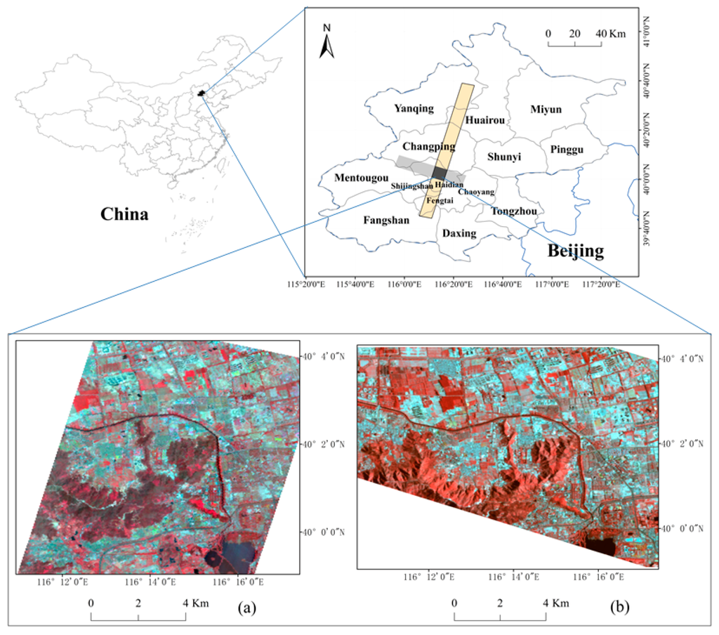 Study area located to the northwest of Beijing, China. In the lower row, (a) the false color EO-1 Hyperion image; and (b) the false color TG-1 image.