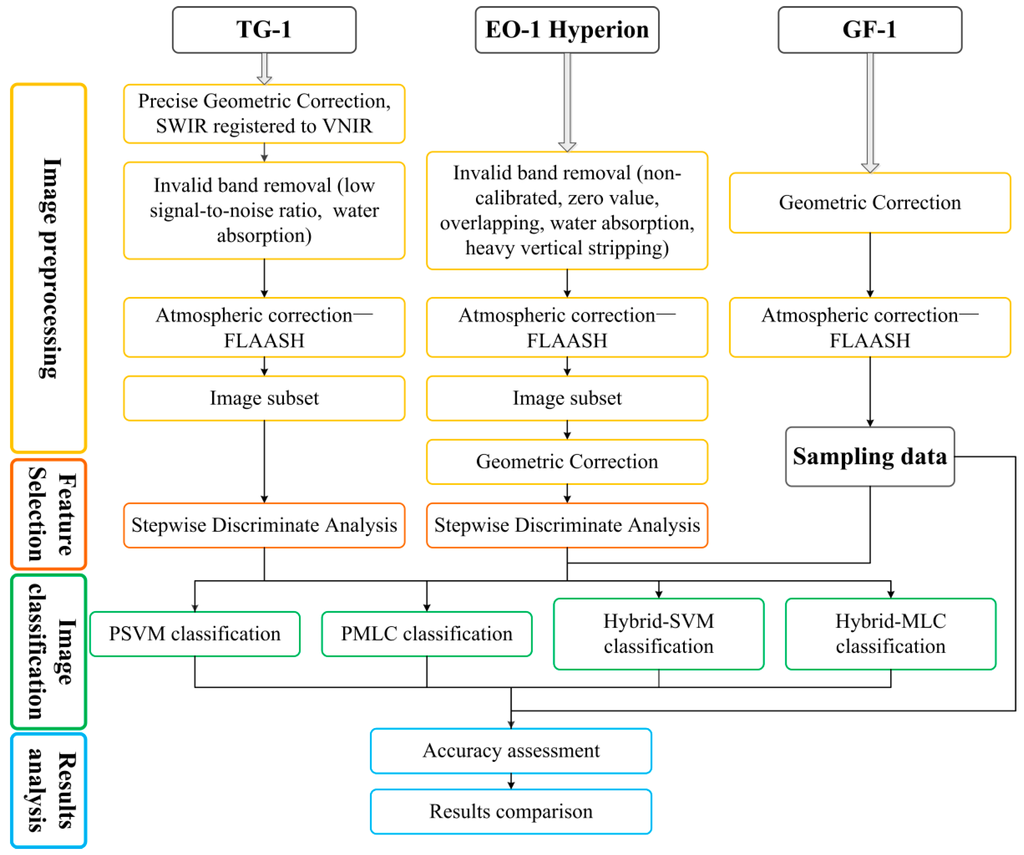 The first step in pre-processing the Hyperion image data was to remove the zero data, duplicated data, and the water absorption and heavy vertical stripping bands. Atmospheric correction was then carried out using the FLAASH module. An image subset of 333 × 431 pixels was extracted from the original Hyperion image, such that it coincided with the TG-1 image data. Geometric registration was accomplished with the aid of the GF-1 pan image and Google EarthTM of the study site, achieving an RMSE of 0.6 pixels using a first-order polynomial transformation. Eventually, following removal of the water absorption bands, as well as the removal of abnormal bands, 158 bands remained for further discriminant analysis.