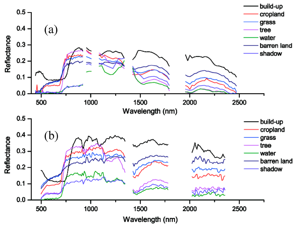Comparison of different spectra reflectance of land-cover types obtained from TG-1 (a) and Hyperion (b), from the corresponding represented pure region.