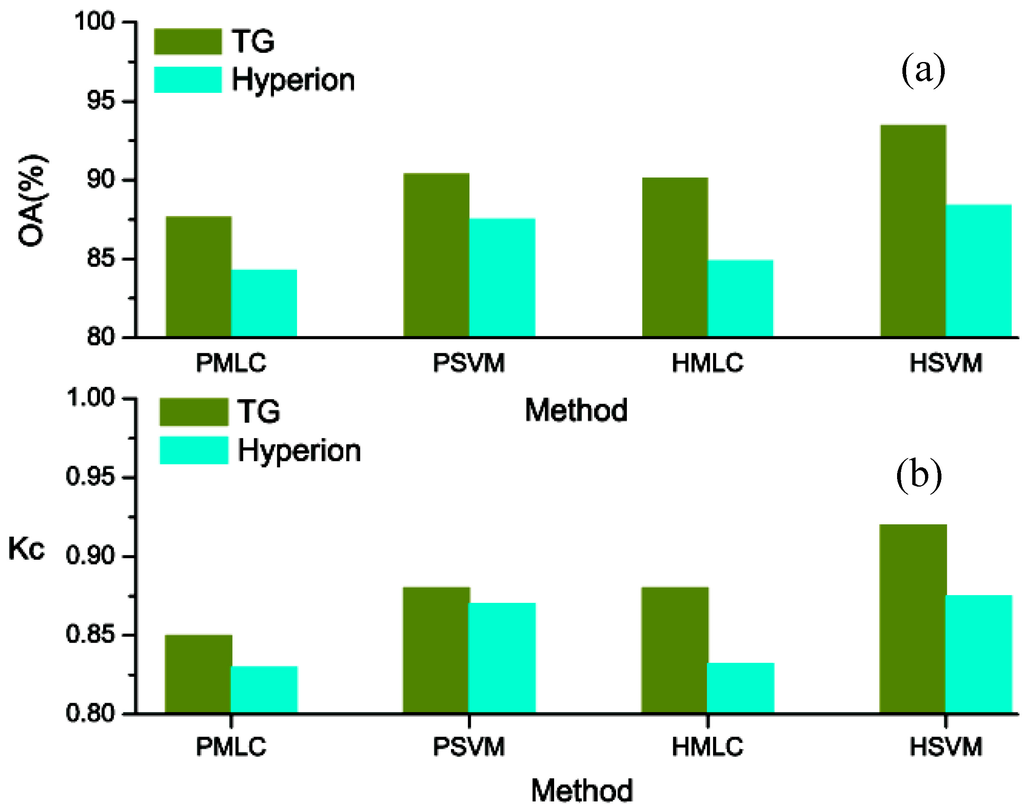 The average value calculated by five-fold cross validation method for the OA (a) and Kc (b) of the TG-1 and Hyperion images classified by using PMLC, PSVM, HMLC, and HSVM.