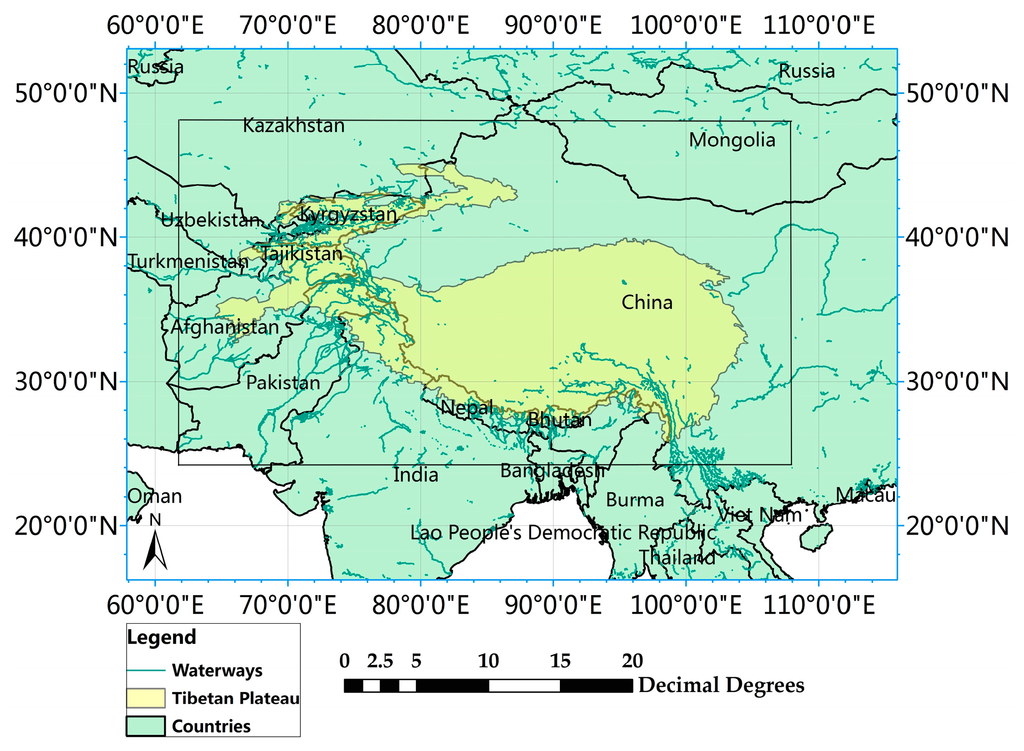 The Tibet is a part of the Tibetan Plateau—a vast flat highland covering an area of around 3,617,367 km2 with an altitude above 4000 m on average [23]. Located at the center of Asia, the Tibetan Plateau is surrounded by numerous glaciers and lakes [24], which make it the source of several major rivers in Asia, such as the Ganges, Indus and Yangtze. Figure 1 shows the location of the Tibetan Plateau (shown in yellow) and the research area within the black rectangular frame (64°E–108°E, 20°N–46°N), as well as major waterways over this region. The complex geographic conditions and massive water storages in the forms of glaciers, rivers, and lakes lead to huge difficulties in recovery of glacier melting rates, water seasonal variations, tectonic motions etc., which are partly attributed to poor conditions for carrying out ground-based observations, e.g., the severe weather and the oxygen-poor environment. In this paper, the mass flux variations in the Tibetan Plateau are calculated from 11-year time series of monthly gravity field models.