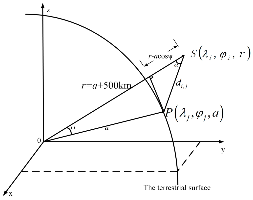 Figure 2 shows the geometry of the space location at the satellite attitude and ground point , where a point disturbing mass is located; di,j is the Euclidean distance between the space location and ground location ; is the spherical distance between and . According to Newton’s law of gravity, if there are n sampling points at satellite attitude and t mascons in the research area, the total radial gravitational disturbance at each location is as follows [15],