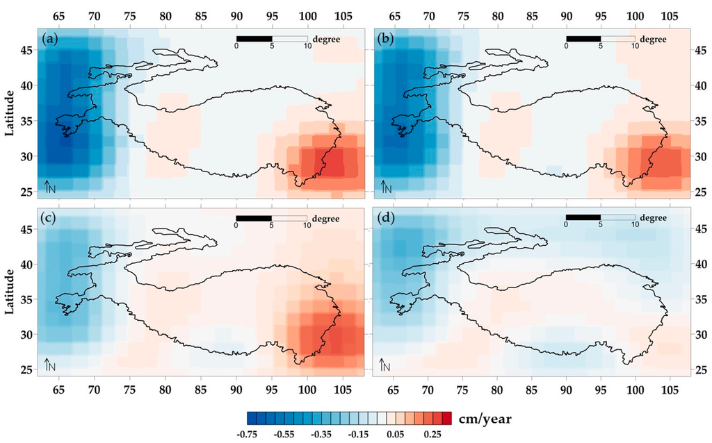 Spatial distribution of mass flux in Tibetan Plateau: (a) CSR RL05; (b) JPL RL05; (c) GFZ RL05a; (d) Tongji-GRACE02.