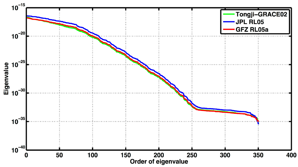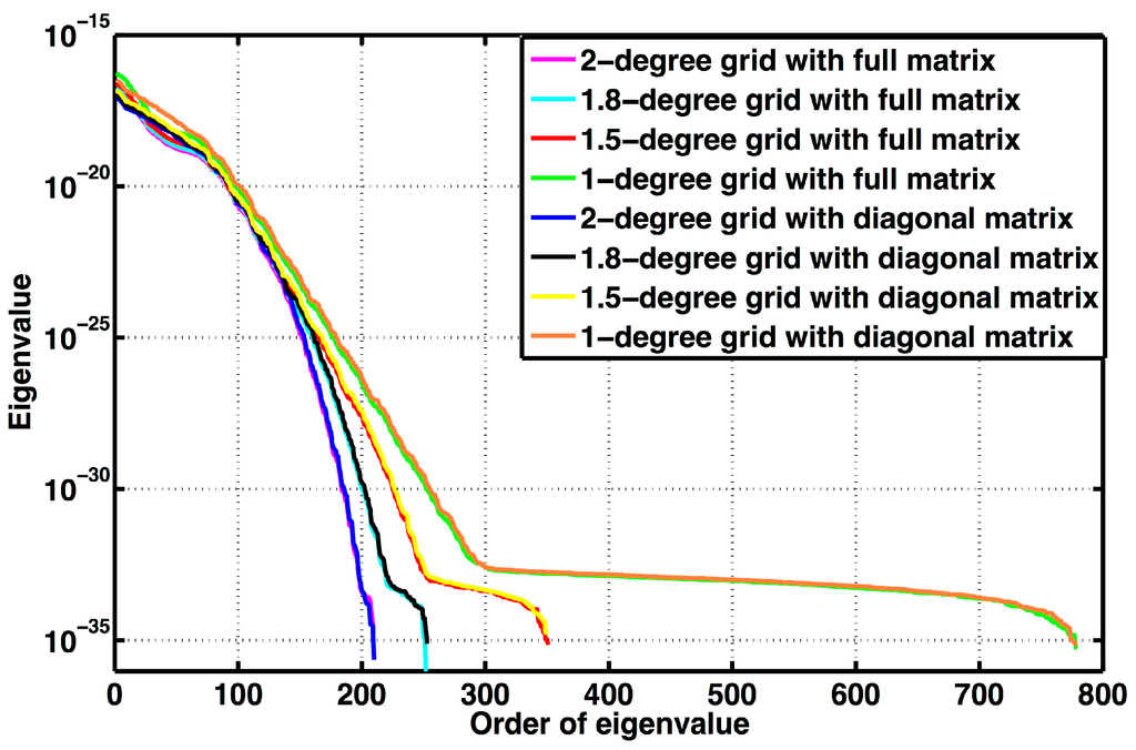 The eigenvalues of the covariance matrices of pseudo observations y in different sampling grid from Tongji-GRACE02 monthly solutions.