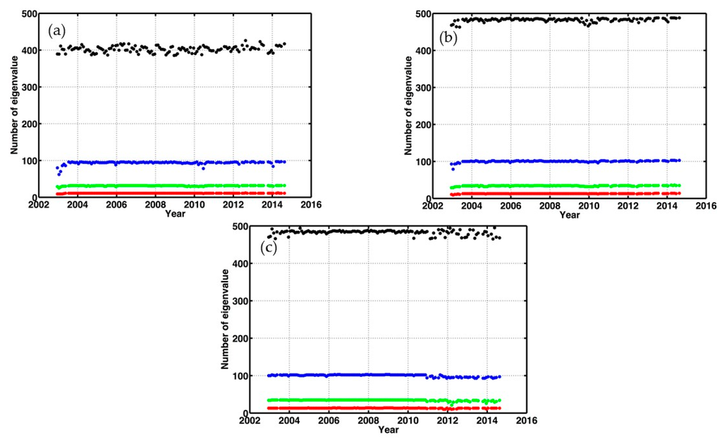 The numbers of eigenvalues less than 5 × 10−33 of monthly solutions with different grid size: (a) JPL RL05; (b) GFZ RL05a; (c) Tongji-GRACE02. (Black: 1° × 1° grid; blue: 1.5° × 1.5° grid; green: 1.8° × 1.8° grid; red: 2° × 2° grid).