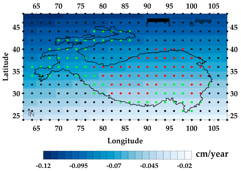 Since signal leakage errors rise proportionally with the strength of signal sources and attenuate rapidly with the increasing distance of signal sources [15], our computed area is about 3 degree larger in all sides than the Tibetan Plateau, which covers a rectangle area of 62°E–108°E, 24°N–48°N. To estimate the leakage errors from outside mass changes of the computed area, we use the additional mascon solutions in surrounding area as the mass change signals, which are computed with the observational Equation (4). The spatial distribution of the trend of leakage errors is presented in Figure 3, in which a positive signal of about 0.2 cm/year occurs in the southern of the Tibetan Plateau, and a negative signal of about −0.6 cm/year occurs in the west of the computed area. Therefore, the leakage errors are corrected in our computation.