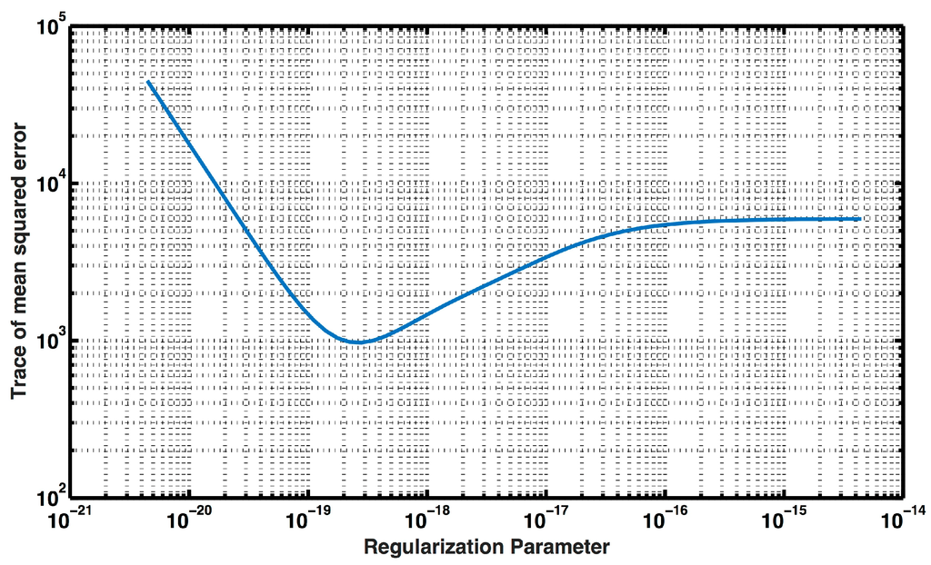 Since the optimal α does not exist theoretically, different methods have been proposed to acquire α, such as the MSE (mean squared error) criterion and the generalized cross-validation method [45]. We apply the MSE criterion that is described in [46,47], because the generalized cross-validation method does not converge in this problem. As for L-curve criterion, Kuche and Klees suggested that it tends to yield over-smooth solutions, especially in the context of satellite-borne gravity field determination [15,48]. We introduce to simplify the equations, and then the mean squared error matrix can be expressed as follows,