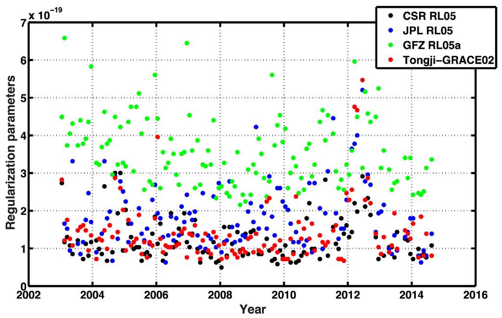 Regularization parameters of CSR RL05, JPL RL05, GFZ RL05a, Tongji-GRACE02 models.