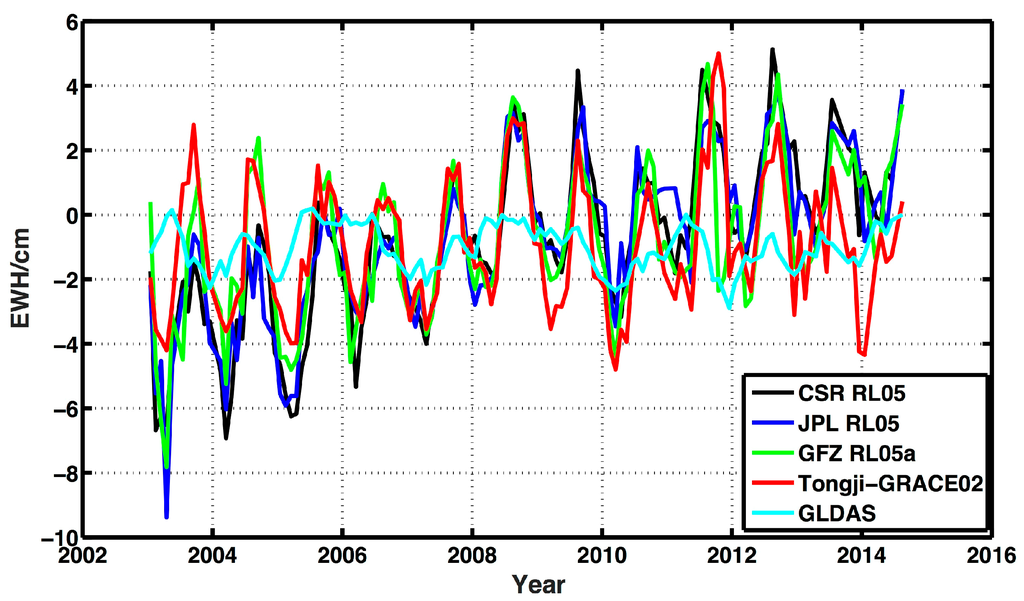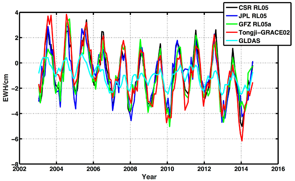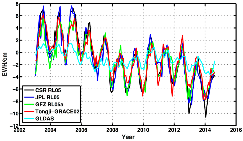 Total mass variations in the Tibetan Plateau resulting from CSR RL05, JPL RL05, GFZ RL05a, Tongji-GRACE02, and GLDAS are drawn in Figure 11, using the time-series of 117 mascons in the Tibetan Plateau. Here we apply the same data processing procedure to the Stokes coefficients expanded from GLDAS and make a comparison, since GRACE and GLDAS contains the same signal source-terrestrial water storage, which is a strong signal in the Tibetan Plateau. GRACE detects all mass change, while GLDAS only contain the top 2–4 m of soil moisture and exclude the anthropology effect [26]. Note that the GLDAS model contains modeling error in the Tibetan Plateau, since it tends to systematically underestimate the surface soil moisture (0–5 cm) while well simulate the soil moisture for 20–40 cm layer [52,53]. Therefore, the amplitude of GLDAS is smaller.
