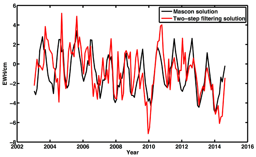 A two-step filtering solution [54] (P4M6 decorrelation and 300 km Gaussian filtering) of CSR RL05 is compared with our mascon solution in Figure 12. Clearer annual variations are detected by our mascon solution than the two-step filtering solution.