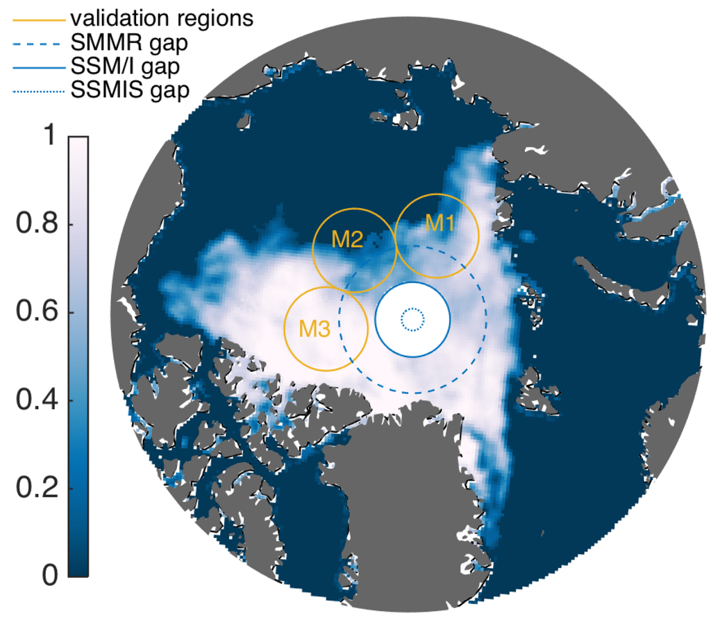 As an additional validation, we also dilated the SSMIS 94-km radius gap to the 311-km radius of its SSMI/I predecessor, and compared modeled and observed concentrations within the 311-km radius region (the 94-km and 311-km radius gaps are indicated by dotted and solid blue circles, respectively, Figure 1). This dilation-based validation has more sampling variability than the M-region analysis because the 94-km radius is available for only 2008–2015, but the results are similar for the two validations (gray curves, Figure 5).
