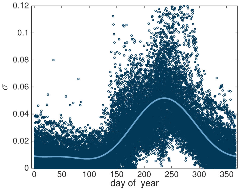 Circles indicate empirical estimates of the standard deviation σ of the stochastic term Ω, as a function of day of the year for 1988–2013, where 1988 is selected because it is the first full year after adoption of the moderately-sized pole hole mask (radius 311 km, Table 1). The curve is a fit of Equation (4) with . Values exceeding 0.12 (less than 1% of the data) are not shown, but were included in the curve fit.