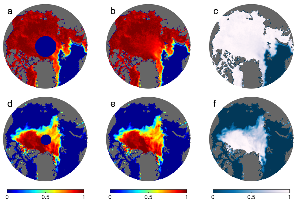 Examples of filling the polar data gap. For 6 January 1985: (a) sea ice concentration; (b) sea ice concentration with polar data gap filled using f (solution to Laplace’s equation plus a stochastic field Ω); and (c) same as (b) but color scheme follows nsidc.org; (d–f) Same as (a–c), but for 30 August 2007.