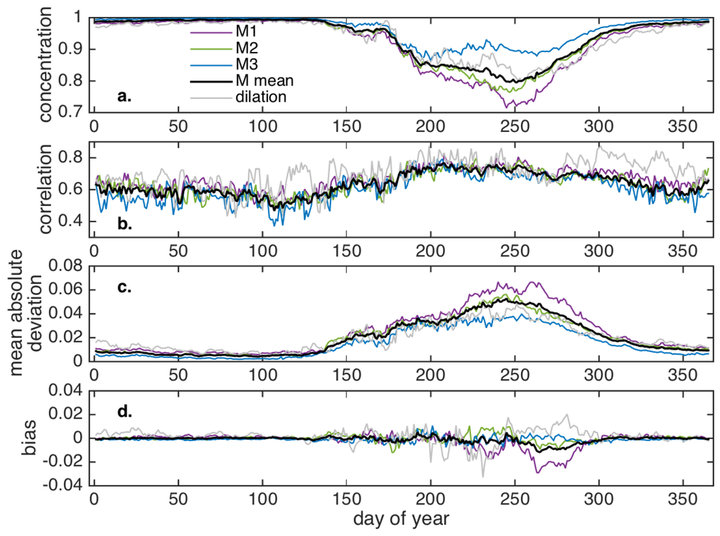 As melt began after day of year 130, concentrations decreased in all three M regions, with declines in M1 and M2 being approximately twice as large as those in M3 (Figure 5a). Correlation between ψ and observed concentration increased to values above 0.7 by day 200, meaning that ψ accounted for more than half of the observed variance (Figure 5b). Composite mean absolute deviations increased with melting, but remained of order (Figure 5c). Composite bias also increased in magnitude during lower concentrations (Figure 5d), reaching close to −0.03 in the M1 region on day of year 264 because local maxima of concentration formed on the interior of this region during several of the analyzed years (recall that the solution to Laplace’s equation precludes local extrema). Averaged across the three M regions, the composite bias remained smaller than in magnitude and averaged overall (black curve, Figure 5d).