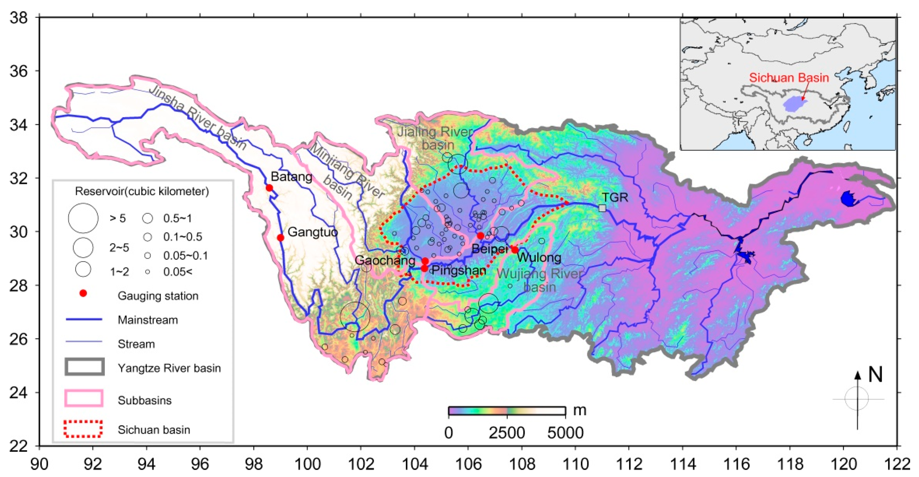 Yangtze River basin and its main sub-basins in the upper reach. The circle represents the location and capacity of reservoirs.
