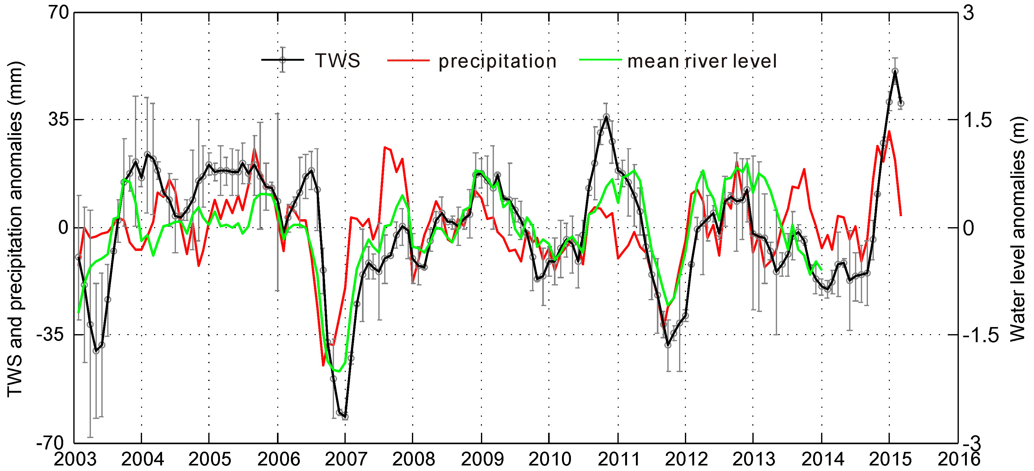 In 2003, GRACE also measured large water depletions with the magnitude close to that of the drought event in 2011. The strong negative anomalies of the mean river level in early 2003 seemed to agree with the water depletion. However, no significant anomaly occurred in the SM (Figure 3a) and precipitation (Figure 5). Considering the large uncertainties of the TWS as well (Figure 5), caused by the relative poor quality of GRACE observations at its early stage [10,45], it is difficult to confirm whether the water depletions in 2003 resulted from hydrological effects. More independent hydrological variables are needed to verify this large anomaly in GRACE-derived TWS.