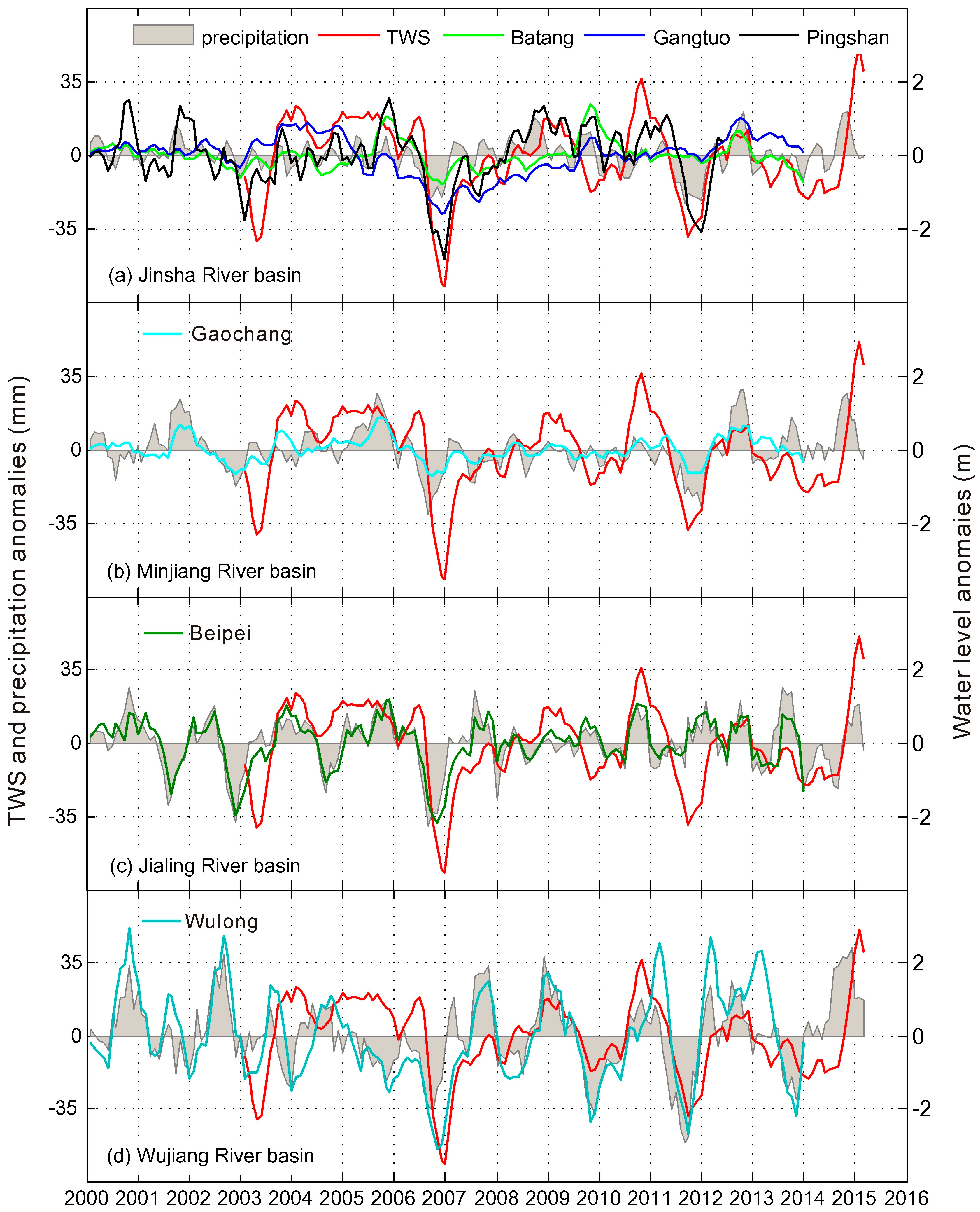 Correlations between the Sichuan Basin TWS and river level at the six gauging stations were further investigated to find the related impacts of water variations in each basin (Figure 6). River levels at Pingshan and Gaochang behaved with higher correlations with TWS than those at other stations, with the same correlation coefficient of 0.68. It is surprising that the correlation coefficient between levels at Beipei and TWS is only 0.54, although the Sichuan Basin includes most areas of the Jialing River basin. This implies that the Sichuan Basin TWS could be influenced by other factors, e.g., water recharge from other neighboring river basins and damming effects in the upper Jialing River. Actually, the Wujiang River basin is not located in the study area, but it disembogues into the Sichuan Basin through Wulong station. The river level variations at Wulong station correspondingly display a relative weak correlation (0.46) with the water variability of Sichuan Basin. However, the significant water deficits observed by GRACE in 2006, late 2009, and 2011 are consistent with obvious negative river level anomalies (Figure 6d). Correlations between TWS and river level at Batang and Gangtuo stations are 0.34 and 0.28, respectively, which are much less than other stations. The reason is that their locations cannot represent the entire Jinsha River basin.
