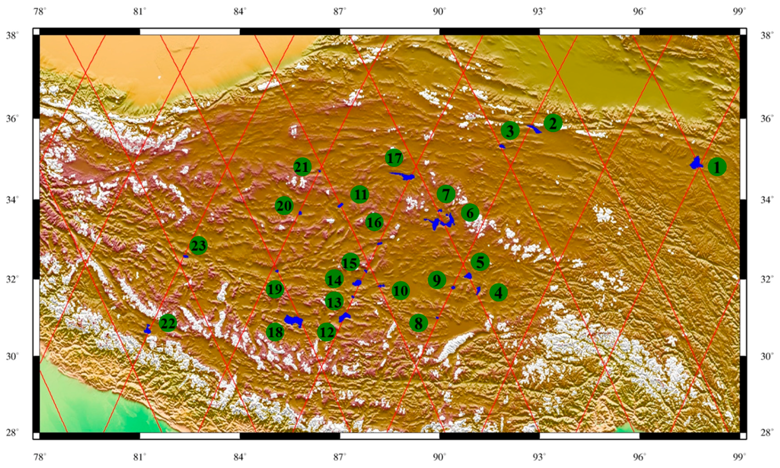 The locations and dimensions of the 23 lakes (blue-shaded) in the QTP observed by the T/P-family satellites. The red lines denote the satellite ground tracks and the numbers represent the lake IDs in Table 1.