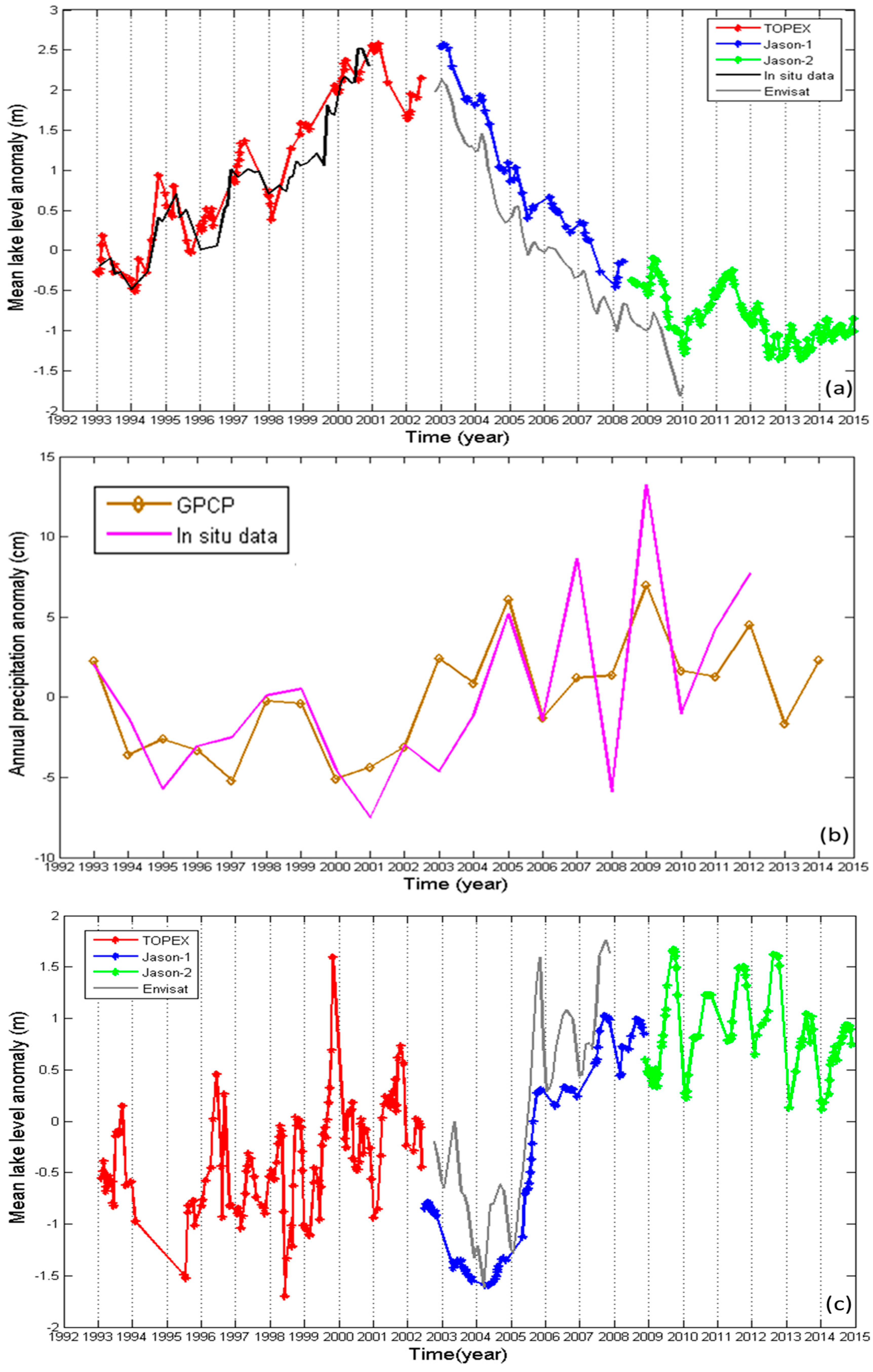 Due to lack of in situ lake gauge records available to the authors, it is challenging to assess the uncertainties of lake level changes from T/P family satellites in the QTP. Here we made two indirect assessments by comparing the lake level changes derived from T/P family satellites (with the method given in Section 3) with in situ gauge records and Envisat results. The first assessment was made at Bosten Lake, where in situ gauge measurements from 1993 to 2001 (roughly the same period as T/P) are available to the authors [37]. Figure 4a compares the lake level changes from T/P with the in situ gauge data at Bosten Lake, which agree well with each other. This Bosten Lake records were also used in Hwang et al. [10], who also reported a similar assessment result like that given in Figure 4a. Lake level changes from Envisat at Bosten Lake are also shown in Figure 4a and are consistent with those from J1 and J2, despite a small inter-altimeter bias between Envisat and T/P-family (more details are given in Section 5.2). The Envisat data were obtained from the European Space Agency (ESA) and processed in the same manner as shown in Section 3. The steady decrease of Bosten lake level since 2003 detected by J1 and Envisat is consistent with the result of Wang et al. [38]. The other assessment is at Eling Lake. No gauge records at Eling Lake are available here, however, we obtained decadal precipitation records from a nearby weather station, provided by National Oceanic and Atmospheric Administration [39]. Figure 4b,c show the annual in situ precipitation records, as well as annual modeled precipitation, monthly lake level changes from T/P family and Envisat at Eling Lake. The modeled precipitation was derived from GPCP through a simple linear interpolation, and it agrees very well with the in situ precipitation records (Figure 4b). This also suggests that GPCP could provide useful estimates of rains in regions without observations in the QTP. Moreover, both in situ and modeled precipitations, around Eling Lake exhibit an increasing trend from 1993 to 2012. Both the J1 and Envisat lake level changes show a reversal of trend around 2004 (Figure 4c). However, the precipitation increased steadily since 2001 without a trend reversal in 2004. The cause for this trend reverse of lake level in 2004 is discussed in Section 4.3. These two assessments show that lake level changes from T/P family satellites are consistent with in situ measurements and results from Envisat. Hence, our processing approach for T/P family satellites is adequate at the 23 lakes.
