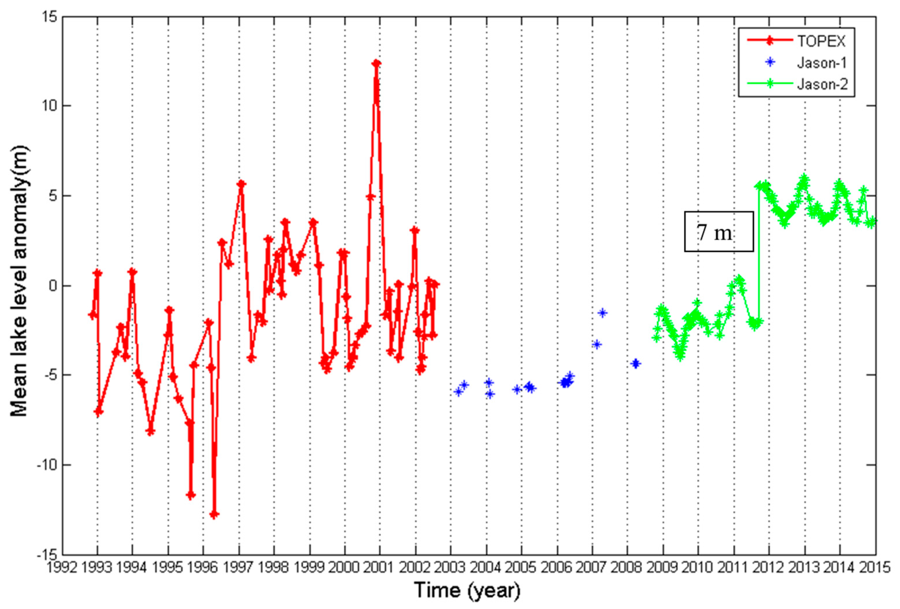 Rates of lake level change (in m/year) from TOPEX/Poseidon (1993–2002) and Jason-2 (2008–2014).