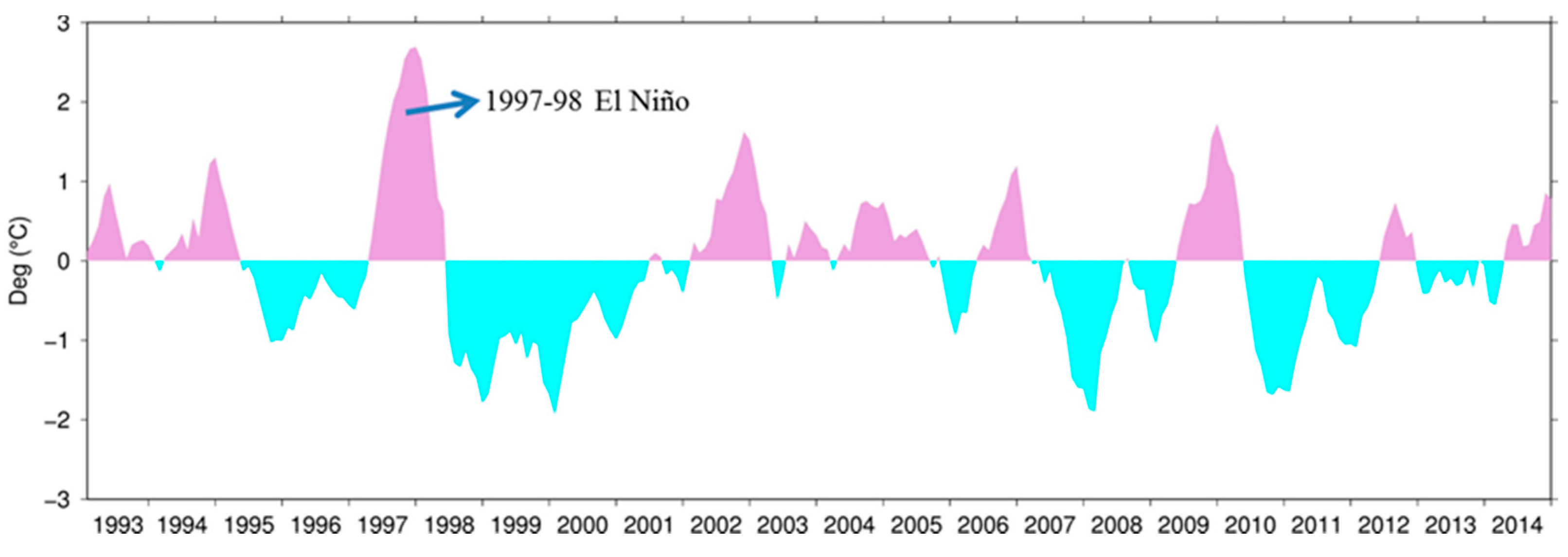 The Niño 3.4 index over 1993–2014, showing the large positive temperature anomalies during the 1997–1998 El Niño.