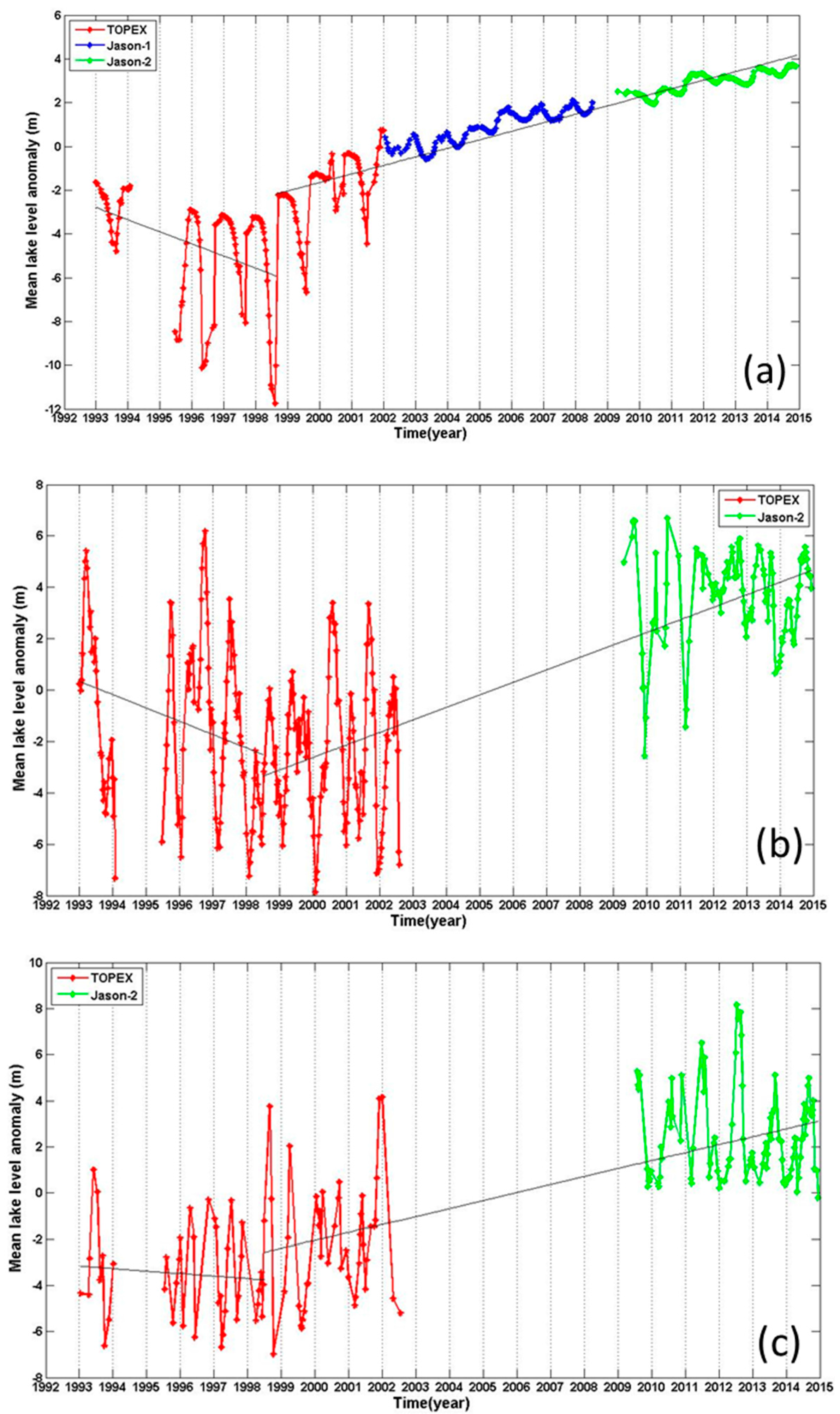 Figure 9 shows three lakes with continuous rising level. Zhangnai Co (Figure 9a) is located in Nagqu of Tibet with water mainly from runoffs. The highs and lows of lake level occurred in summer and winter. Over January 1993–December 2014, the mean rising rate is 0.60 m/year. Over 1993–2000, the rate decreased to 0.28 m/year, with peaks of lake level oscillations up to 5 m. There is no J1 observation at Zhangnai Co. Over January 2009–December 2014, J2-observed lake levels are about 10 m higher than the mean lake levels from T/P over 1993–2000. From 2009 to 2014, the rising rate became more moderate at 0.1 m/year, but the peaks of height oscillations reached 15 m.