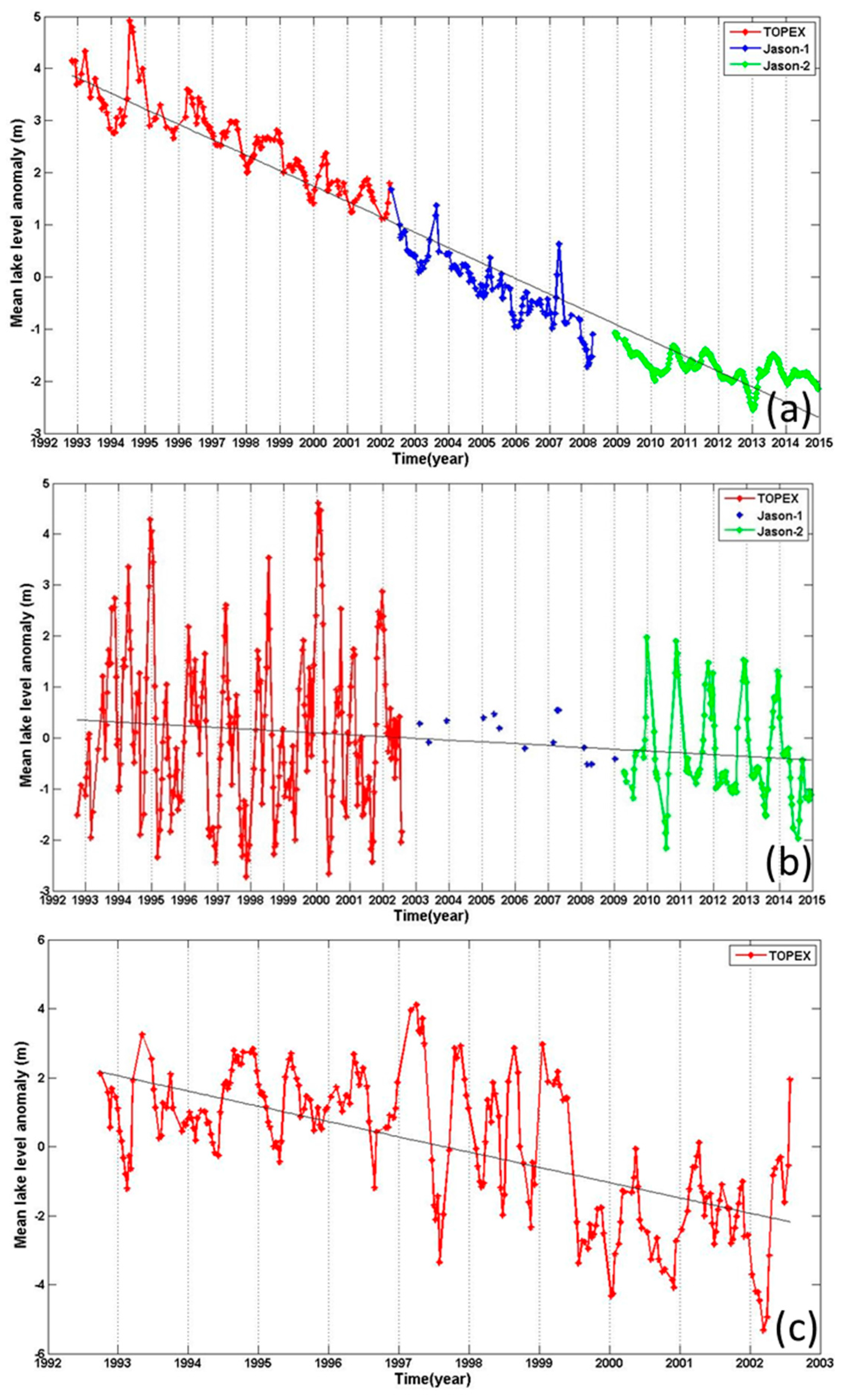 Figure 8 shows three lakes with continuous dropping trends: La’nga Co (Figure 8a), Zhapu Co (Figure 8b), and Margog Caka (Figure 8c). La’nga Co is located in the interior of Tibet and is adjacent to its sister lake, Mapam. T/P passes through the deepest part of this lake, delivering good waveforms for further improvement by the subwaveform retracking. Over January 1993–December 2014, the mean rate of lake level change here is −0.30 m/year. However, the rate varies with time: over 1993–2002, 2002–2008, and 2009–2014, the rates are −0.27, −0.34 and −0.09 m/year, respectively. Seasonal lake level oscillations are evident, with the lows and highs in December and August.