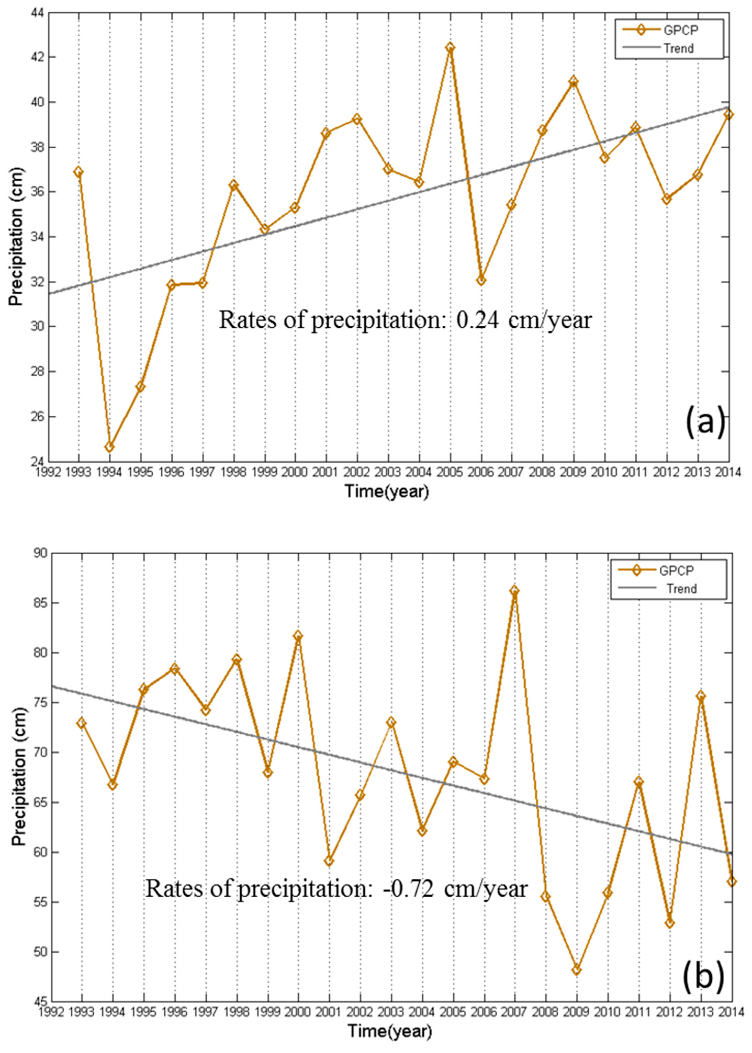 In Section 4, we show the general pattern of lake level rate and selected lake level time series, and point out the connection between the rates of lake level and the rates of precipitation. The lakes with the same feature of lake level change are basically close geographically, and are related to their locations in Tibet that have different extents of influences by the Indian monsoon, East Asian monsoon and westerlies. To expand the discussion in Section 4, Figure 10 shows the trends of annual cumulative precipitations from GPCP at the centers of La’nga Co (continuous falling lake level) and Chibuzhang Co (continuous rising lake level). The precipitations at La’nga Co declined steadily over January 1993–December 2014, slowing down between 2009 and 2014. In contrast, at Chibuzhang Co, there is a sharp decrease of precipitation in 1994, followed by rises between 1994 and 2001. In summary, the GPCP-derived precipitation trends are coherent with the trends of lake levels at Chibuzhang Co and La’nga Co, and can partially explain the latter.